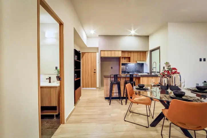Con una amplia sala comedor que se ilumina con luz natural gracias a sus grandes ventanales, este modelo ofrece un espacio abierto y acogedor. Dispone de 2 habitaciones, 2 baños completos y 2 lugares de estacionamiento exclusivos. La habitación principal está diseñada para maximizar el confort, con una distribución que garantiza un descanso reparador y un baño privado que añade un toque de privacidad y comodidad adicional.